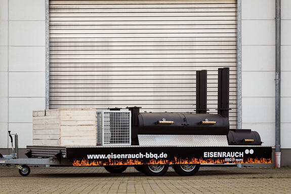 Jeder der vom Barrel 40 überzeugt ist, wird vom Smoker-Anhänger, mit mehr als 4 Meter Garraum, begeistert sein. Der Trailer kann mit 2 Smokern, die einen Durchmesser von 20 Zoll und einer Rostlänge von 80 Zoll = ca. 2,00 Meter, gebaut werden.